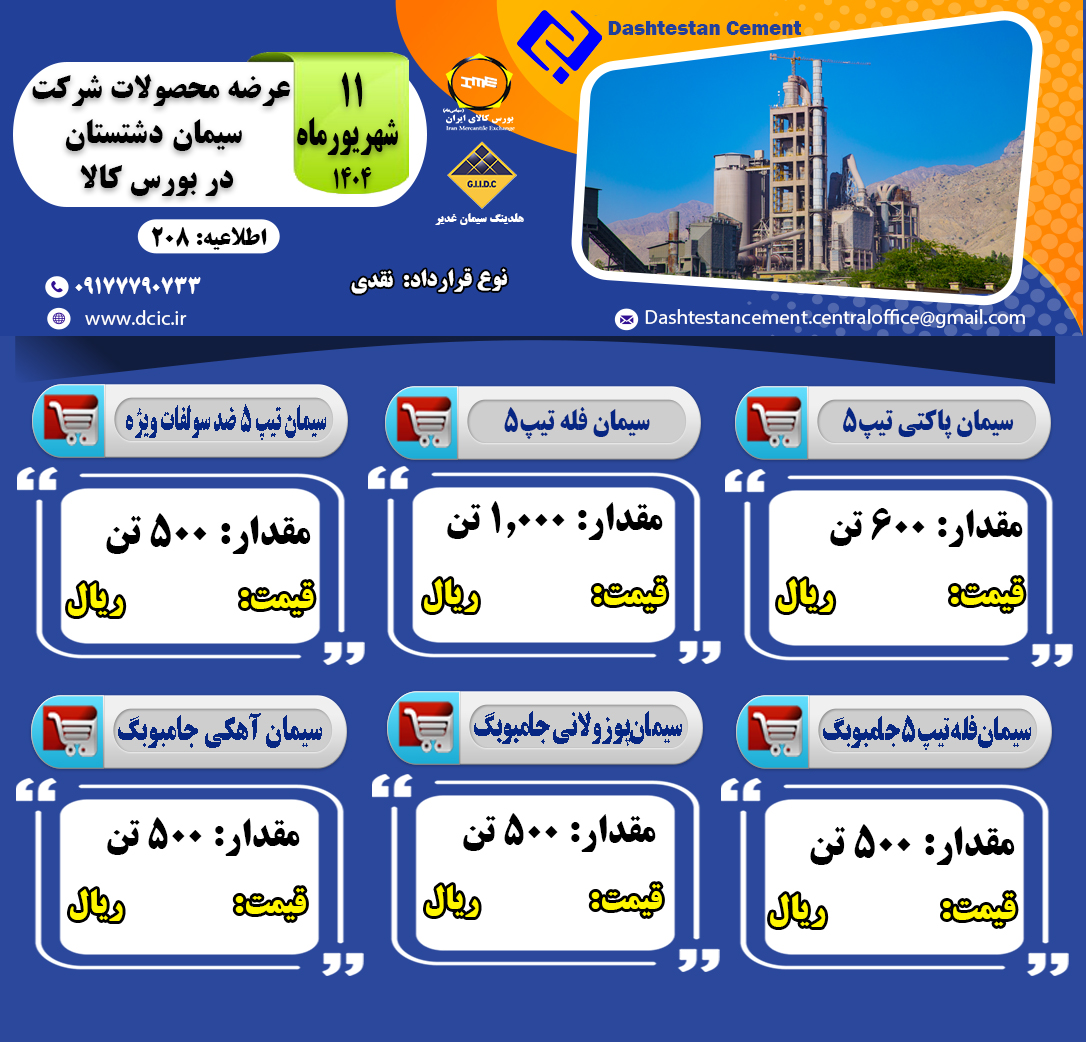 عرضه محصولات شرکت صنایع سیمان دشتستان در بورس کالا در تاریخ ۱۱ شهریور ماه ۱۴۰۴