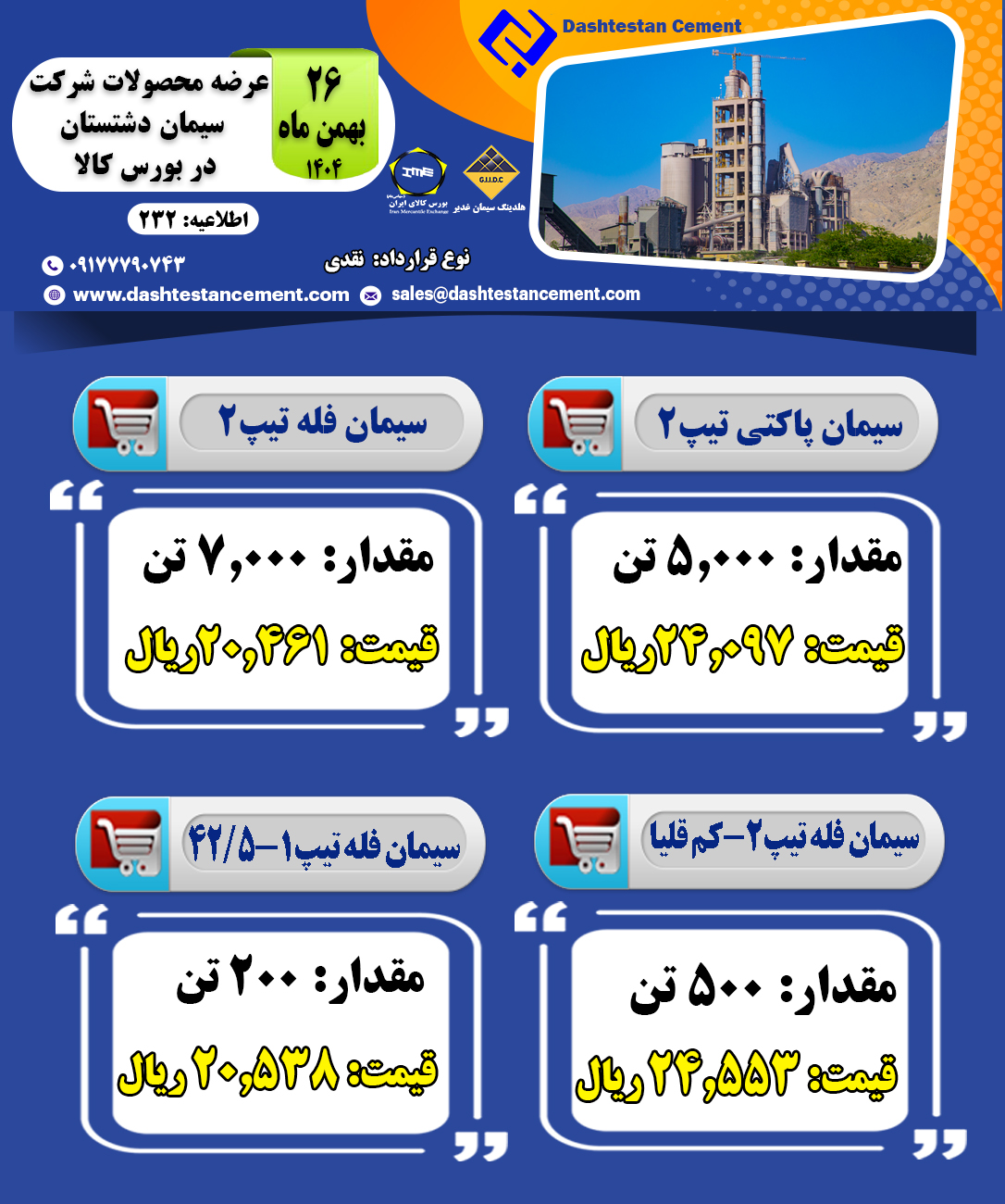 عرضه محصولات شرکت صنایع سیمان دشتستان در بورس کالا در تاریخ ۲۶ بهمن ماه ۱۴۰۴