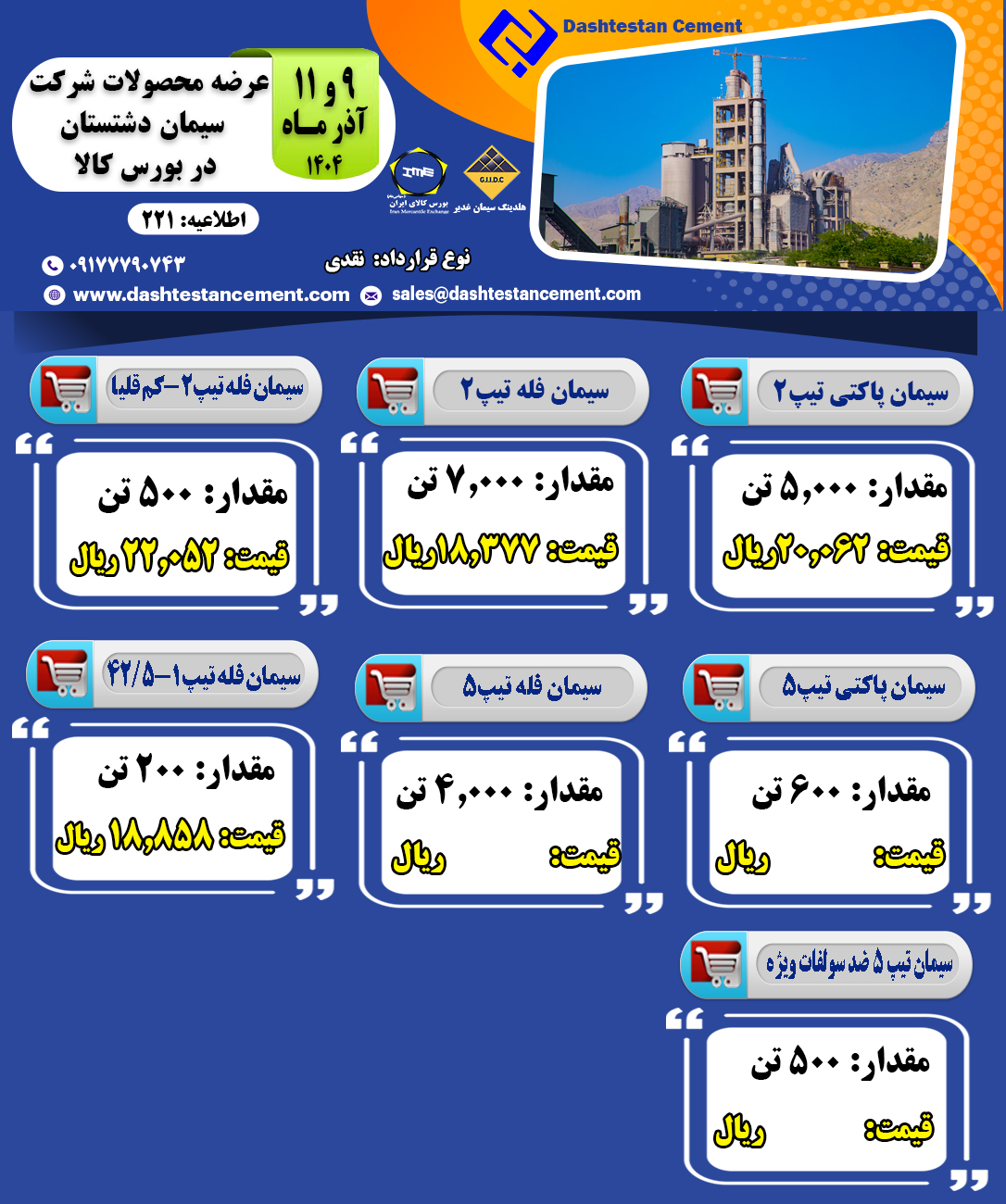 عرضه محصولات شرکت صنایع سیمان دشتستان در بورس کالا در تاریخ ۹ و ۱۱ آذر ماه ۱۴۰۴