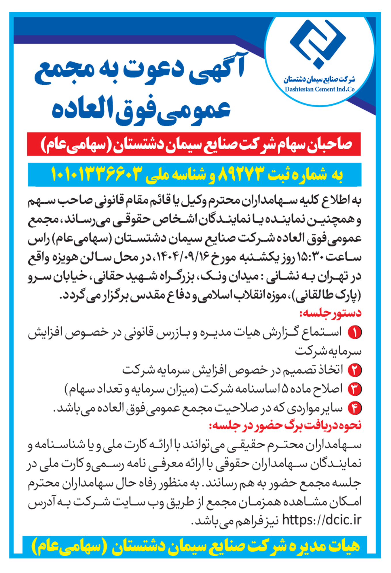 با عنایت به مجوز افزایش سرمایه با شماره مجوزDPM-IOP-04A-102 مورخ ۱۴۰۴/۰۷/۲۰ از کلیه سهامداران ، وکیل یا قائم مقام قانونی صاحب سهم و همچنین نماینده یا نمایندگان اشخاص حقوقی دعوت میگردد تا در جلسه مجمع عمومی این شرکت که در ساعت ۱۵:۳۰ روز یکشنبه مورخ ۱۴۰۴/۰۹/۱۶ در استان تهران ،شهر تهران به آدرس میدان ونک،بزرگراه شهید حقانی،خیابان سرو (پارک طالقانی)،موزه انقلاب اسلامی و دفاع مقدس ، سالن هویزه برگزار میگردد حضور بهم رسانند.